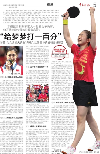 3日晚,青岛晚报记者和陈梦父母、启蒙教练共同全程观看了女乒决赛,记录下他们的激动时刻。同样的欢呼、同样的加油呐喊,3年前东京奥运会决赛在陈梦家的一幕仿佛重现:第二次在青岛现场见证陈梦夺冠,同样是4比2的比分,然而却有不一样的激动和感慨。走过的这三年对于陈梦来说,是布满荆棘与坎坷的道路,一度陷入“冠军荒”,在奥运女单名额争夺中长期陷入劣势,但这位坚韧的青岛姑娘从未放弃,她再次用奥运会女单冠军,向世界证明了自己。