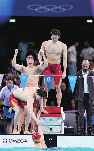 8月4日,中国队选手徐嘉余、覃海洋、孙佳俊、潘展乐在夺冠后庆祝。当日,游泳项目男子4×100米混合泳接力决赛中,中国队以3分27秒46的成绩夺得金牌。 新华社发