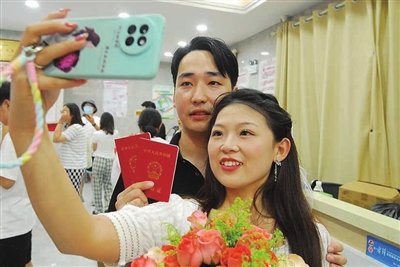 在婚姻登记处,很多新人在领取结婚证时,都有专业人士记录。“今天是七夕,领证的新人比较多,我们也忙。”一名跟拍摄影师说。