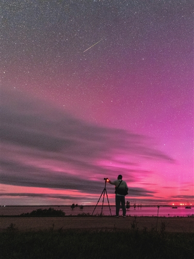 “我们8日抵达哈密后就开始了观测活动。越是临近极大期,观测到的流星数量越多。这些流星中,很多都是‘红头绿尾’,其中不乏异常明亮的火流星。11日和12日晚,我们均做了直播,将浪漫的流星雨分享给国内网友,一起感受这场星空的年度盛宴。值得一提的是,12日还发生了大地磁暴,我们因此幸运地遇上了极光。有了极光的加持,让这场流星雨变得更加美丽。”王俊峰说。