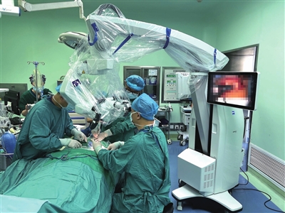 术前,团队通过三维重建3D可视化技术完善术前检查,全面观察肿瘤周边结构,与功能区的关系及回流静脉及静脉窦的关系,发现肿瘤已经完全将颅骨侵袭,术中大量出血的风险非常高。术中,主刀医生发现肿瘤血供极为丰富,切开头皮及切除颅骨外肿瘤时就有大量出血,老人的血压持续下降。麻醉医生及时输液并配合输血科输血,保证其生命体征稳定。孙国庆在显微镜下仔细操作,迅速切除颅骨外肿瘤控制出血,然后在高倍视野下充分保护脑组织,分离肿瘤与脑功能区的界限,全部切除颅内及侵袭进入静脉窦的肿瘤,并修补了破坏缺损的颅骨。术后老人恢复良好,经过康复综合治疗,逐渐能够站立并行走了。 观海新闻/青岛晚报/掌上青岛 记者 于波 通讯员 马华