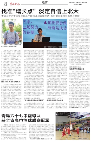 据了解,近年来,青岛六十七中学全力推进青岛市“十个一”项目和体育工作三年行动计划,立足教育抓体育,抓好体育促教育,坚持五育并举,强体兴校,推进教体融合,以体育人,形成了学校篮球引领、教体融合、五育并举的良好局面。学校男子篮球队在体育教研组和主教练李磊老师的带领下,连续16年蝉联青岛市篮球联赛高中男子组冠军,先后7次获得山东省冠军。在2024年耐克中国高中篮球联赛中,获得全国总决赛亚军,创造了青岛市乃至山东省中学生篮球的历史最好成绩。