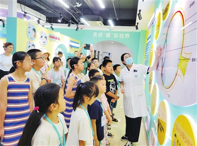 小记者完成眼视光检查后,来到全生命周期眼健康科普区。从婴童时期,到少年、青年,再到中老年,每个年龄段对应不同的眼视觉情况,示意图以眼睛造型、内嵌眼部解剖图等形式,系统地为小记者梳理了全生命周期的眼健康知识,让大家更直观地了解我们的眼睛。