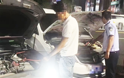 本报8月25日讯 8月24日晚,几名安徽游客的车辆在井冈山路抛锚。几人正着急时,民警及时赶到,帮他们重新启动了车辆。