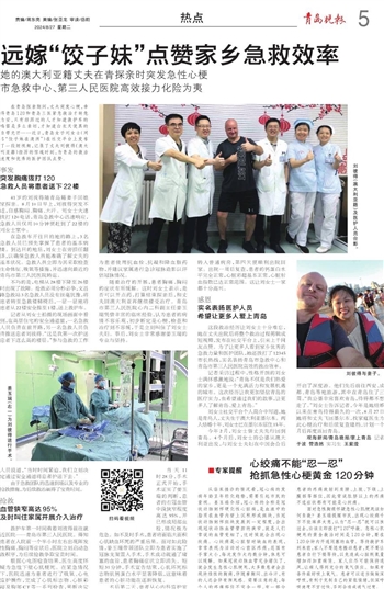 随着治疗的开展,患者胸痛、胸闷的症状有所缓解。这时刘女士表示,是否可以开点药,打算结束探亲后,和丈夫回澳大利亚再继续接受治疗。青岛市第三人民医院心内二科副主任姜玉瑞凭借丰富的临床经验,认为患者的病情不容乐观,初步断定是心梗,检查和治疗刻不容缓,于是立刻叫住了刘女士夫妇。事后,刘女士非常感谢姜玉瑞的专业与坚持。