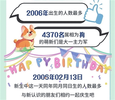 新生中最多有6名同学同名同姓,还有10个子涵、7个浩然、6个俊杰。姓氏当中,老王家学生霸榜,张、李、刘、陈、孙、赵等姓氏紧随其后。新生中还有雒(luò)、庹(tuǒ)、郗(chī、xī)、郇(huán、xún)等不常见姓氏。新生中2006年出生人数最多,4370人属相为狗,其中有30人出生于2006年2月13日。