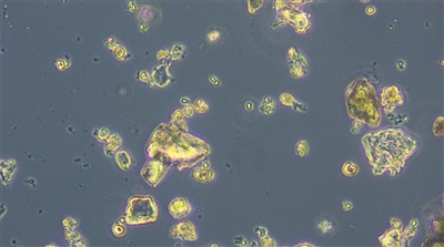 市环科院专家现场取样后,拿到实验室分析。在百倍显微镜下,产生神秘“蓝光”的夜光藻现身。