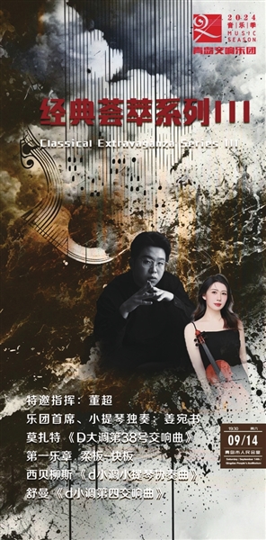 音符与灵魂共舞,奏出生命的乐章。青岛交响乐团2024音乐季《经典荟萃系列 III》9月14日在青岛人民会堂奏响。本场音乐会特邀董超指挥,乐团首席、小提琴独奏姜宛书。音乐会曲目包括莫扎特《D大调第38号交响曲“布拉格”》、西贝柳斯《d小调小提琴协奏曲》、舒曼《d小调第四交响曲》等。