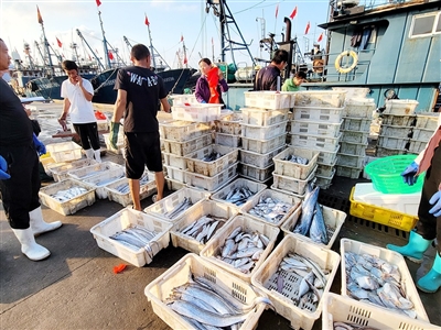 8日清晨的积米崖渔港码头一派繁忙,满载而归的渔船整齐停靠,一筐筐新鲜的海鲜被搬运上岸,分拣、称重、装车,运往市场和外地;零售摊前,顾客络绎不绝,鲅鱼、刀鱼、螃蟹、鲳鱼、八带、小黄花……刚上岸的各类海鲜备受青睐。出海的渔民收获满满,趁早抢“鲜”的市民游客同样“满载而归”,整个码头洋溢在丰收的氛围里。观海新闻/青报全媒体 记者 梁超 摄影报道