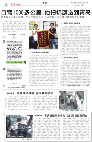~~~来青探亲丢失手机被公交员工接力寻回 江西教授让儿子登门赠锦旗表达谢意