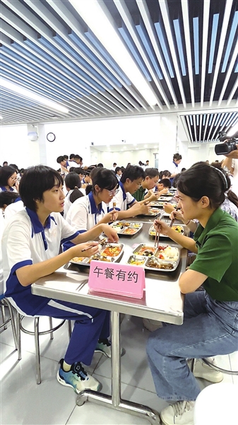 19日中午,下课的同学们迫不及待走进学校食堂,虾仁炒黄瓜、土豆炖牛肉、西红柿炒蛋、莴苣炒山药四道热气腾腾的菜品及烧麦、杂粮馒头、米饭等各色面食已盛入餐盘,整齐摆放于10个取餐窗口。记者观察到,取餐区使用的是人脸识别支付终端,每名学生取餐全过程仅需几秒钟,每个取餐队列聚集不会超过5米。“在食堂直接吃饭更方便了。”九年级5班学生张世润告诉记者,堂食饭菜更新鲜,同学们再也不需要帮忙搬盒饭了,中午多了近15分钟休息时间。
