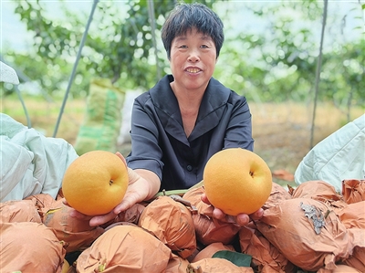 秋月梨以汁水甘甜充盈、松脆无渣闻名。在日渐干燥的秋季,香酥多汁的秋月梨受到很多青岛人的青睐。在北赵线蓝王线路口西北角,葛埠村村民潘秀芳种植的21亩秋月梨陆续成熟,从8月20日开始迎来采摘季。“今年的果树成熟了,产量比去年翻倍。”潘秀芳说,她承包的土地是沙质土壤,可以提供梨树生长所需的氧气和水分。除此之外,果园地势高便于排水,且光照充足,她及时施以有机肥,让今年的梨园亩产超过了万斤。