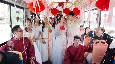 迎亲当天,一辆精心装饰的公交车准时到达目的地,大红“囍”字挂在公交车头,横幅海报“我们结婚啦”“永结同心 百年好合”以及婚纱照贴满车身,将接亲的仪式感“拉满”。新人孙先生、赵女士身着华美婚服,在亲朋好友的共同见证和陪伴下,一起登上“幸福婚车”,向幸福出发。