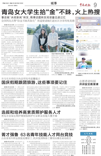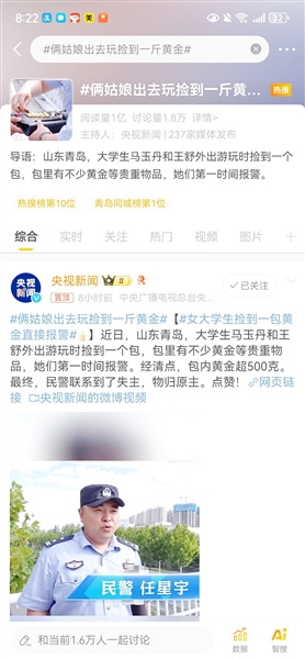 本报9月24日讯 24日本报报道了青岛酒店管理职业技术学院的两名女生马玉丹、王舒捡到重一斤多黄金,当天就报警归还失主的新闻。当天中午,两名女生拾金不昧的事迹被“央视新闻”微博转发,还上了百度、微博的热搜。
