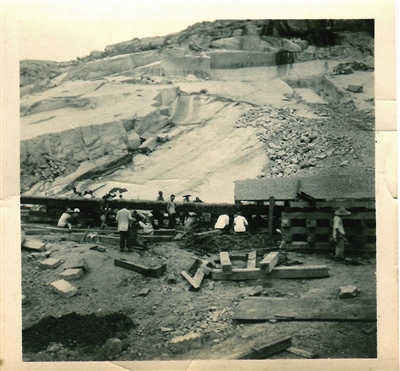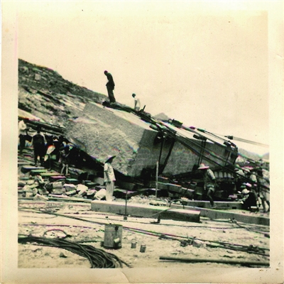 起重工人利用原始作业工具,通过绞、磨、推、拖、吊、拉等方式进行作业,当时主要用来搬运石料的分别是一部推土机和一部卷扬机,石料置于卷扬机上面的钢骨架上,由推土机牵引。起重工人们在铁轨前方用推土机当牵引,拉着滑轮组中的一根钢索前进,每前进一段距离,就要把原来在最后面的枕木移到最前面。