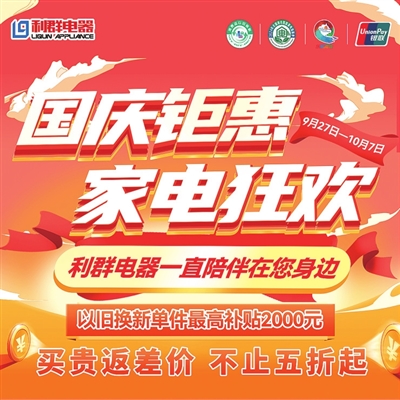 9月27日至10月7日国庆活动期间,利群电器福利多多,惊喜连连。超值折扣,让消费者以意想不到的价格将心仪的电器带回家。“国庆钜惠,家电狂欢”期间,可享受以旧换新单件补贴最高2000元、满额送好礼、套购赠好礼、指定机型半价起、满百返千、9月28日整点返券等多重活动,让消费者买得实惠又安心。在利群,专业的导购团队,随时提供贴心的服务。他们以丰富的专业知识和热情的态度,为消费者解答各种疑问,帮助消费者挑选最适合的家电产品。