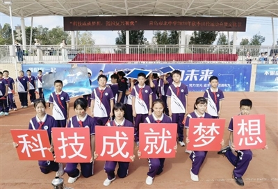本报9月29日讯 29日,青岛市北中学举办以“科技成就梦想,强国复兴有我”为主题的2024年秋季田径运动会暨第五届校园文化节。开幕式上,全校学生列队依次进场,《神舟五号》《杂交水稻》《第一颗原子弹》《新能源汽车》……怀揣科技报国情怀,在老师们的指导下,各班鲜明的主题展演将建国以来科技大事件一一展示。