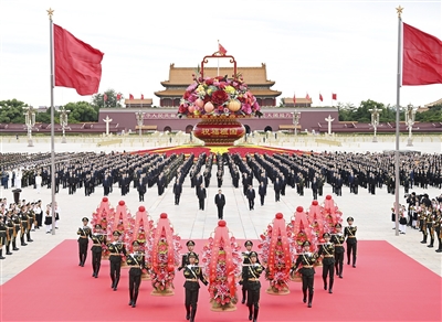 纪念碑前,2400多名各界代表手持鲜花,列队肃立。他们中有耄耋之年的老战士、老同志,有胸前佩戴着红飘带的烈士亲属,有国家勋章和国家荣誉称号获得者代表,有受表彰的民族团结进步模范代表,有朝气蓬勃的青年学生和少年儿童。