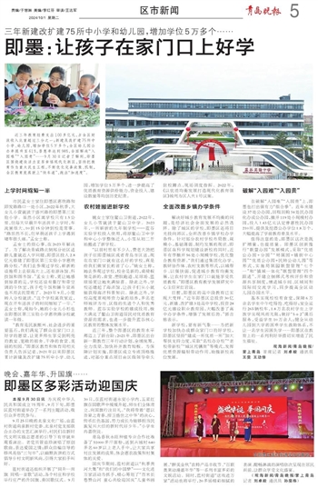 “教育是民族振兴、社会进步的重要基石,我们满足了群众在家门口上好学的愿望,让更多师生享受到明亮的教室、宽敞的宿舍、干净的食堂、美丽的校园。”即墨区教育和体育局相关负责人告诉记者,2021年以来即墨区累计新建及改扩建75所中小学、幼儿园,增加学位5万多个,进一步提高了优质教育资源供给能力,资金投入、建设数量等均创历史纪录。