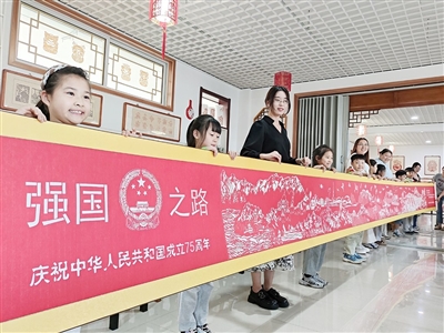 本报9月30日讯 走进胶州市北关小学百米剪纸长廊,14.75米的剪纸长卷《强国之路》瞬间吸引了大家的目光。为庆祝中华人民共和国成立75周年,北关小学的8名老师和16名学生共同创作了剪纸长卷,讴歌新中国成立75年来的伟大成就。