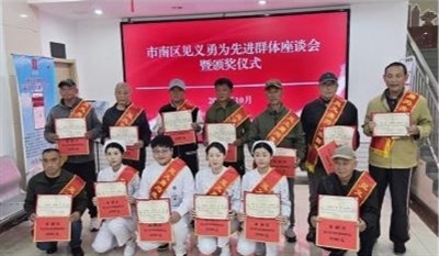 22日上午,在市南区湛山街道盐城路社区,市南区委政法委、市南区见义勇为协会举行见义勇为先进群体颁奖仪式,为近期下海救人的四个群体颁发“市南区见义勇为先进群体”荣誉证书和奖金。受表彰的群体中,就有《青岛晚报》新闻人物——“巧克力大爷”李勇、陈爱国和他们的同伴戴志庭、孙光杰。