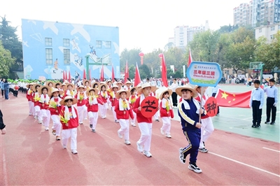 运动会上,国旗方队的学生们迈着坚实有力的步伐走向主席台。家长组成的红旗方队昂首阔步,尽显家校同频共振的美好,为孩子们的成长保驾护航。随后,二十四个班级方队分别代表二十四个节气,进行精彩又富有创意的展示。动听的吟唱、琅琅的诵读、动感的舞蹈、飒爽的武术……映衬着学生们灿烂的笑脸、蓬勃的精神,是自然之美与运动之魂的完美彰显。