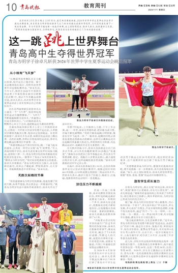 北京时间10月29日晚上10时30分,在巴林首都麦纳麦,2024年世界中学生夏季运动会男子跳远决赛结束,来自青岛为明学校的徐卓凡以7.46米的跳远成绩夺得冠军,为中国代表队拿下一枚宝贵金牌。作为中国男子跳远唯一的选手参赛,站上国际领奖台,徐卓凡表示,他既激动又失落,“很荣幸我能够为国家争光、为学校争光,失落是因为没有突破自己7.73米的最好成绩。”