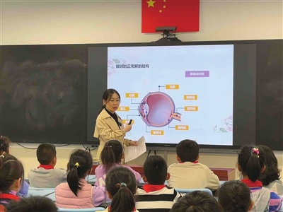 “眼睛是人体重要的感官之一,其结构主要包括角膜、虹膜、晶状体、视网膜和视神经等部分。”通过一则短片,姜文静为同学们带来的爱眼护眼“小课堂”正式开讲。人的眼球发育主要分为两个阶段,婴幼儿阶段和青少年阶段。婴幼儿时期,眼睛尚未发育成熟,屈光状态呈远视,随着生长发育眼球会逐渐“正视化”。在小学阶段眼轴的增长相对较快,若用眼习惯不佳,可能导致屈光异常,形成近视。研究表明,眼轴长度每增加1毫米,近视度数便增加约200-300度。通过讲解,让师生认识眼睛的发育规律,关注近视发生的早期征兆,能够有效帮助家长和学生及早发现视力问题。