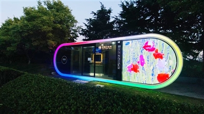 位于崂山区香港东路南侧的石老人公交站公厕,外观动感活泼,科技感十足,正立面采用“夜景亮化+媒体窗口”的设计,具有多样化灯光变幻效果与媒体功能,结合室外音响,实现场景及音乐变换,让行人身临其境。由于占地面积较小,且外形酷似“胶囊”,所以又被称为“城市胶囊公厕”。公厕内部不仅有化妆镜、除臭香氛、共享充电宝等设施,还配有智能生态系统,具有环境监测、紧急报警、蹲位监测等功能,并通过信息电子屏实现“可视化”,如高科技舱一般,给城市增加了新场景,给市民带来了新体验。