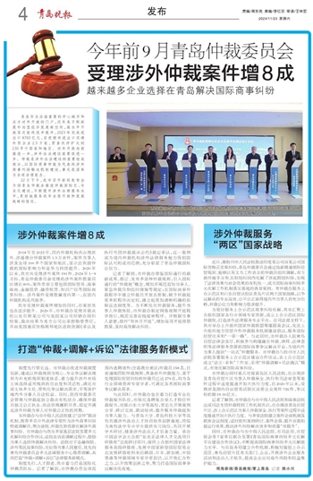 2018年至2023年,国内仲裁机构共办理涉外、涉港澳台仲裁案件1.3万余件,案件当事人涉及全球100多个国家和地区,显示出我国仲裁的国际影响力和竞争力持续提升。2020年以来,我市共受理涉外案件191件,2024年1-9月份,青岛仲裁委员会受理的涉外案件数量同比增长80%,案件类型主要包括国际贸易、海事海商、金融投资、融资租赁、知识产权等国际商事纠纷。涉外案件受理数量省内第一,在国内仲裁机构名列前茅。