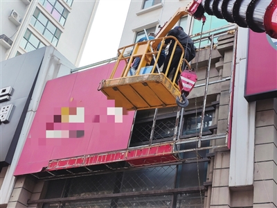 11月27日下午,记者在九水东路看见,伸出吊臂的吊车停在一幢高层住宅楼底座的店面前,工人们正在拆除一块挡住二楼窗户的广告牌。李沧区综合行政执法局浮山路中队执法人员告诉记者,这块广告牌面积达130多平方米,是他们近期拆除的面积最大的广告牌。到下个月初,他们还将拆除附近10多块挡住二楼窗户的广告牌。