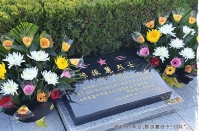 工作人员协助陈振麓的家属将骨灰盒放入编号为400的墓穴石棺内,由工作人员砌筑石板并加盖烈士墓碑。家属眼含热泪,将两束鲜花放在墓碑两旁。全体人员向墓碑三鞠躬致敬。“爷爷,您安息吧,您归队了!”陈振麓的侄孙女陈艳喜极而泣,“过了85年,您终于以烈士的身份,再次和战友们在一起了。爷爷,您牺牲得早,没看到国家解放,现在国家发展得很好,我们国家强大了!”