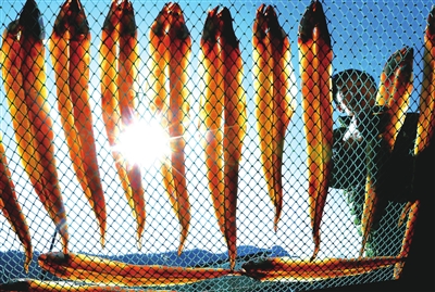 12月3日,山东省青岛市即墨区鳌山卫街道垛石村的渔民在晾晒鱼干。