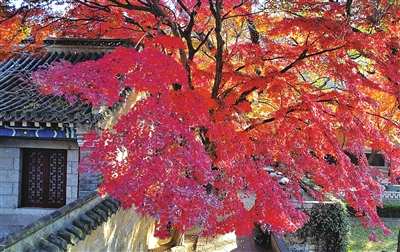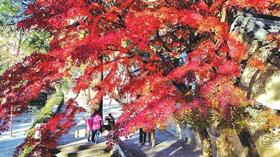 当天上午,董志刚漫步在崂山太清宫步月廊,用无人机航拍换上“红装”的五角枫。枫叶的红,是那鲜嫩欲滴的绯红,红得层次丰富,如同少女羞涩的脸颊。阳光透过枝叶的缝隙,洒下斑驳的光影,落在地上、廊间,像是给这片红色世界铺上了一层纱幕,营造出一种如梦似幻的美妙氛围。“拍摄最佳的时间是上午9点左右,光线刚刚从山顶上照射下来,那个时候的光线最适合拍摄。”董志刚解释说,因天气渐冷,要是摄影师也想拍摄到古枫优雅的“身姿”,一定要选择近几天拍摄,不然就会错过这一年一度的火红“枫”景。