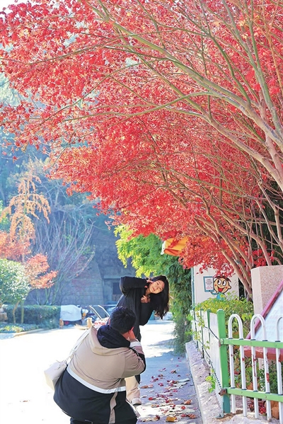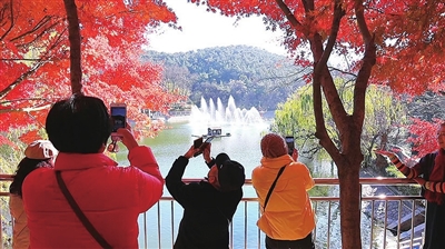 北岭山森林公园,是青岛市区中部最大的综合性森林公园,也是市北区首批向社会推出的网络微短剧免费拍摄场景地之一。初冬时节,青松翠柏间,可见火红的枫树点缀其间,宛如碧玉间镶嵌的红宝石。而枫树最集中也最为壮观的,当属小西湖西部的观景台。阳光从枫叶缝隙中穿射进来,将每一片枫叶照得火红、通亮。透过枫叶看去,翠绿的垂柳随风摇曳。人们在枫林里拍照,在湖水边漫步,与蓝天暖阳一同勾勒出一幅幅流淌的油画。