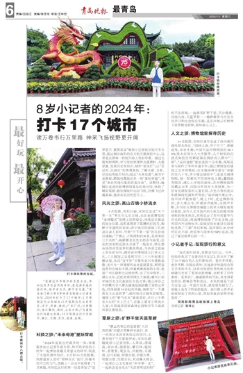 “我看过许多城市的名胜古迹,参加过许多社会实践活动,在充满乐趣的旅行中,眼中有光芒,脚下有力量。”青岛金门路小学8岁的青岛晚报小记者宋知忆,2024年打卡了17个城市:1月寒假出行山东烟台;5月假期出行山东枣庄、济宁、济南、潍坊,广东广州,江西赣州,浙江衢州、湖州,山东日照;7月暑假出行内蒙古赤峰;10月假期出行江苏扬州、镇江、无锡、苏州、南通、盐城。