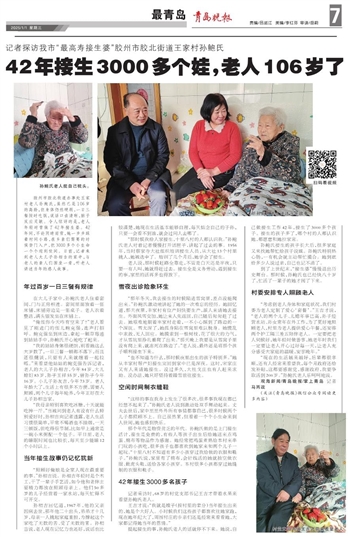 胶州市胶北街道办事处王家村老人孙鲍氏,虽然已是106岁的高龄,但身体仍然硬朗,一日三餐按时吃饭,说话口齿清晰,脑子反应灵敏。令人惊讶的是,老人年轻时曾做了42年接生婆。42年间,不论阴晴雨雪,她一步步踩着村间小路,在乡亲们需要的时候登门入户,把3000多个小生命一个个迎到世间。日前,记者来到老人大儿子孙相吉的家中,与老人的亲人们围坐一旁,听老人讲述当年的感人故事。