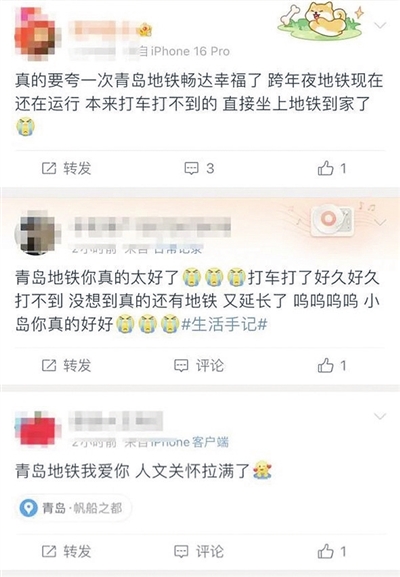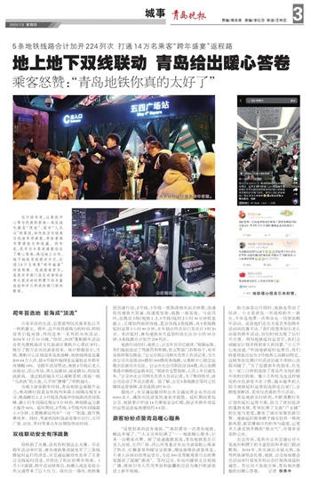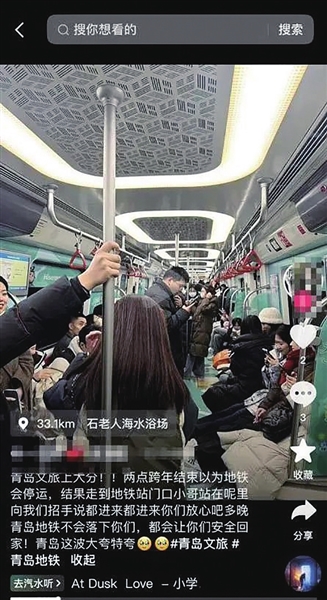 助力游客出行同时,地铁也带动了经济。小王是青岛一所高校的大一新生,今年是他第一次和舍友一同参加跨年活动。此前他们还在为是否参加跨年活动而犹豫不决。“我们很想参加石老人浴场的跨年活动,但怕时间太晚了出行不方便。得知地铁延时运营后,我们立刻敲定计划并得到家人的同意。”小王开心地说道。“听说地铁延时运营后,我们特意将旅店定在2号线燕儿岛路站附近,这样参加完倒计时活动后就不用担心返程问题了。”为了迎接新年的到来,杜先生一家三口特别选择了青岛作为他们跨年夜的目的地。像小王和杜先生这样情况的市民游客不在少数,越来越多的人因为地铁延时运营而选择走出家门,去拥抱更鲜活、更有仪式感的节日活动。