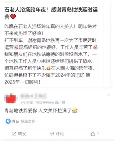 小红书、抖音等社交平台上,关于“石老人浴场跨年”“地铁站内等待看日出”等话题引起广大网友的共鸣。“感谢青岛地铁延时运营”“感谢青岛地铁让我有家可归”等称赞不绝于耳,好评、点赞一屏装不下。