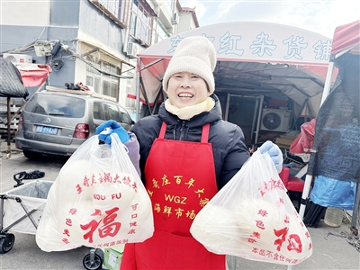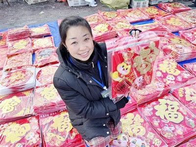 一排排红彤彤的春联摊位增添了节日的喜庆,有的字体遒劲有力,有的图案精美可爱,每一副春联都蕴含着对新春的美好祝愿。摊主杜女士告诉记者,今年的春联种类更加丰富多样,既有传统的吉祥话语,也有创意的新式春联。“我跟对象两个人在这卖了好几年了,我们是即墨的,基本上每个集都来。卖得最好的是带金穗的,今年新出的立体六层的也销量不错,总体上比较高端的卖得好。”杜女士笑盈盈地拿起福字贴向记者展示。