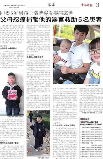 稚嫩童真的笑脸、清爽利落的短发,照片上天真开朗的小男生,名叫王浩博,5岁。2024年末、2025年初,一场突如其来的疾病在短短几天时间里夺走了他鲜活的生命。猝不及防的离别,给他年轻的父母带来无尽的悲伤。经过深思熟虑,这对来自即墨的父母做出一个充满大爱的决定,捐出孩子的器官。来自小浩博的一肝两肾和一对眼角膜,将给5名患者带来“新生”的希望,也让小浩博的生命以另外一种形式获得“重生”。