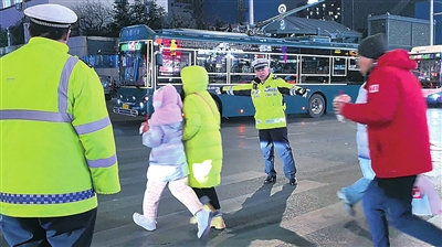 气温已经降到0℃,很多出行的市民戴上了棉帽,或者将羽绒服的帽子立起裹住头顶。下午6时许,雪花开始在空中飞舞,在台东地铁站前的台东一路上,交警要求路边停放的车辆驶离。“前面有个小坡,冰雪天气,必须确保这一路段畅通。”记者顺着民警的指引注意到,在斑马线前,有交警在护送行人过马路,前方还有交警执勤,提醒车辆减速慢行。