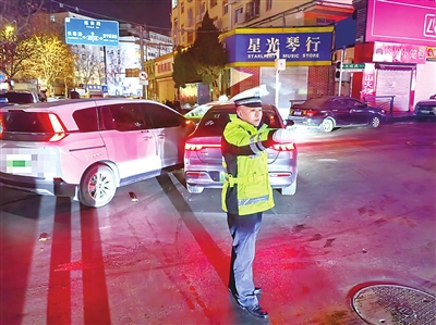 市北交警威海路中队指导员张见平和同事坚守在校门口两侧,指挥车辆通行,提醒变道车辆让行。“在这里,我们要执勤到晚7点。”张见平告诉记者,校门口北边50米,交通繁忙,接送孩子的车辆叠加晚高峰车流,交通压力让交警一刻也不敢放松。