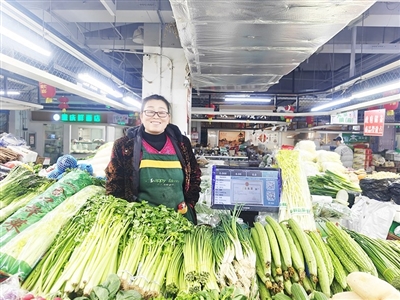 “我在这里卖了15年蔬菜了。2020年市场改造升级,这对买卖双方都是好事。以前使用普通的电子秤,我们为了称重方便,电子秤位置放得比较低,不方便顾客看斤两信息。现在电子秤带着大显示屏,单价钱数一目了然,没有纠纷。而且新系统对农残要求很严格,倒逼商户通过正规渠道进菜。为了保证进货品相好,我们每天赶早去批发市场‘抓货’,挑货头。”经营蔬菜摊位的代女士告诉记者。