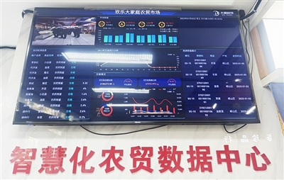 在欢乐大家庭农贸市场北门有一块显示屏,滚动展示着农贸市场的信息,各种蔬菜的农残检测数据,产品价格,蔬菜、水果、海货、肉类成交量占比,顾客数量、客单价等一目了然。