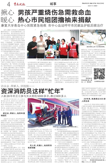 28年来,王江以灾情为命令,以群众需要为己任,在人民群众最需要的时候冲锋在前、义无反顾,先后参加灭火抢险5000多次,抢救遇险群众600多人。王江先后荣立个人一等功1次、二等功3次、三等功5次、嘉奖21次,获评“齐鲁最美消防员”“山东省先进工作者”等荣誉称号。“荣誉只能代表过去,如果还有任务,我依然会冲在第一线!”王江说。 观海新闻/青岛晚报/掌上青岛 首席记者 刘卓毅