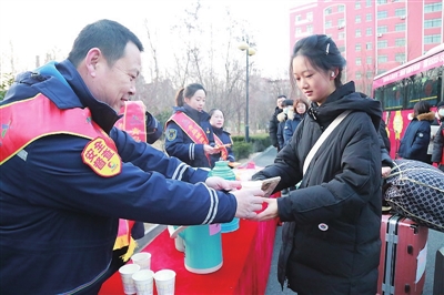 7时30分,一辆满载学子的学子返乡快车从滨海学院校园缓缓驶出。今年的学子返乡快车仍采用往年发车模式,从校园一站直达铁路青岛站。公交隧道公司在青岛滨海学院校园内设立了“暖行志愿服务站”,为返乡大学生准备了一次性口罩、暖宝宝,并随车赠送新年福字、春联、蛇年吉祥物等,给返乡路增添暖意。公交车厢内还设置急救箱,配备糖果、创可贴、腹泻药品、云南白药喷雾等,以备不时之需。来自日照的刘岩告诉记者:“这是我第二次乘坐返乡快车,听说今年直接送到火车站,睡一觉就到站了,省去了很多麻烦。”