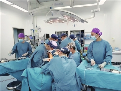 为了进一步综合确定治疗方案,医院启动多学科会诊,口腔颌面外科、重症医学科、麻醉科、病理科、影像科、手术中心和病房护理团队等进行广泛而深入的探讨,做足了术前、术中及术后准备。口腔科主任杨学财和团队为李先生实施了手术,扩大切除原发灶并截除部分下颌骨,完成淋巴结清扫,再从患者左侧小腿取下一块带血管的腓骨瓣,移植到下颌骨,钛板钛钉固定,修复重建下颌骨,并在显微镜下将腓骨瓣的血管与颈部血管吻合,重建血液循环。在协同治疗及精心护理下,李先生病情逐渐好转,术前担心因为手术“毁容”的他,现在精神状态良好,吞咽和说话都没有受到影响,已经顺利出院。