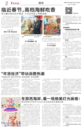 “小年之后会有大量帝王蟹进店。从往年销售情况来看,小年之前会有一批顾客通过盒马鲜生的社群微信预订帝王蟹,小年之后几天部分顾客进店提货,他们以返程回老家过年为主。我们为其准备了泡沫盒和冰袋,确保24小时保鲜。还有一部分顾客临近春节进店提货,他们多是在青岛过年。”徐女士表示。
