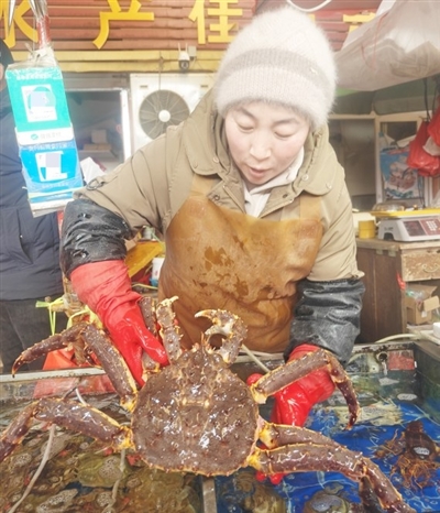 杨女士的摊位在售帝王蟹,一只5斤多重的帝王蟹十分吸睛,“近年来,把帝王蟹摆上餐桌的人越来越多。去年进了小年后,我这里订出去近四十只帝王蟹。”